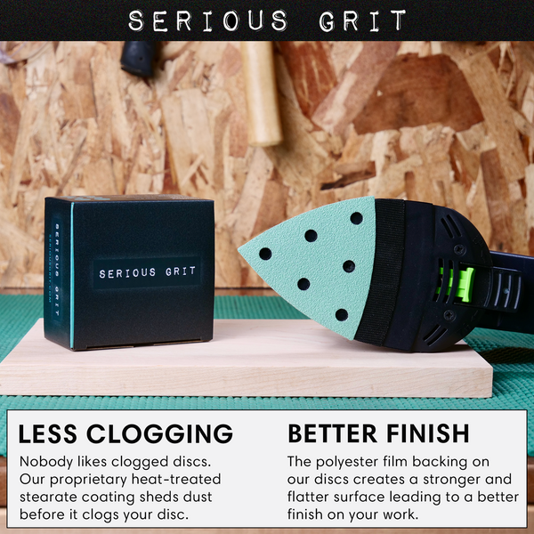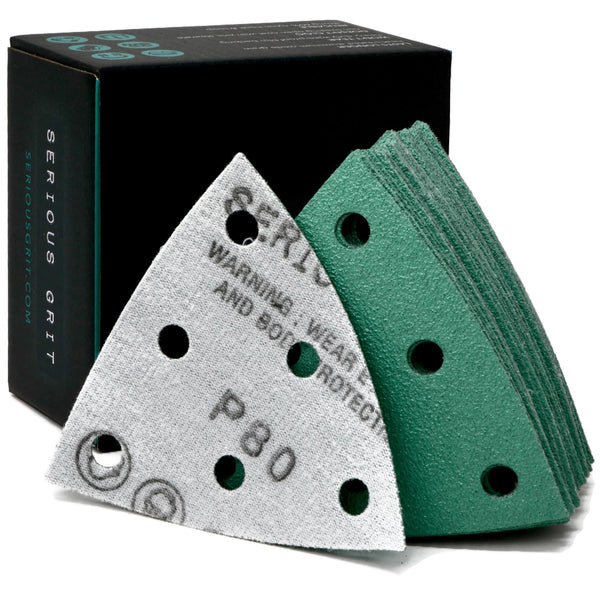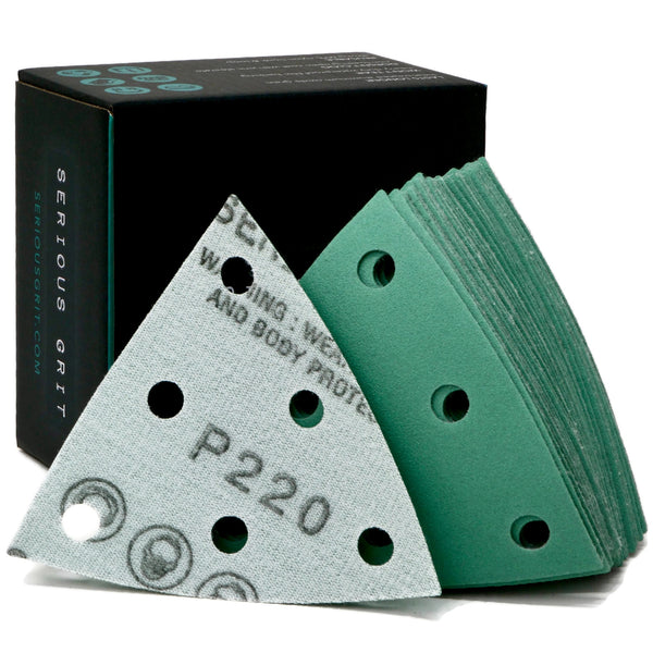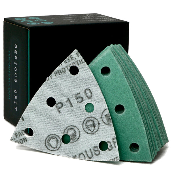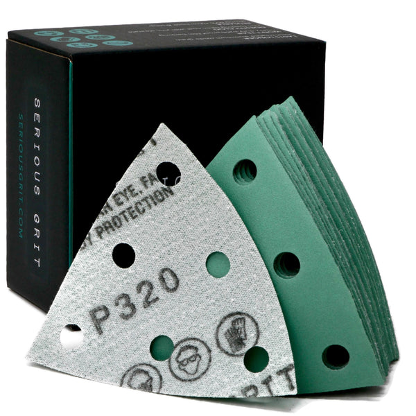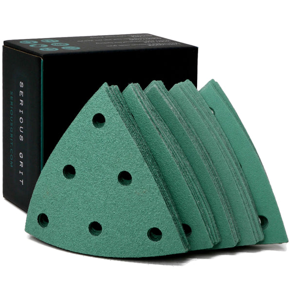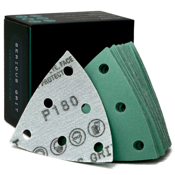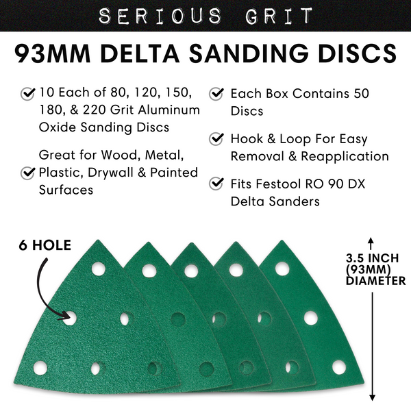 FITS FESTOOL RO 90 DELTA – Serious Grit 3.5-Inch, 6-Hole hook & loop triangle sanding sheets are compatible with the Festool Rotex RO90 Delta 93mm detail sander. These sanding discs are ideal for sanding all surfaces, including wood, metal, drywall, epoxy, and painted surfaces.