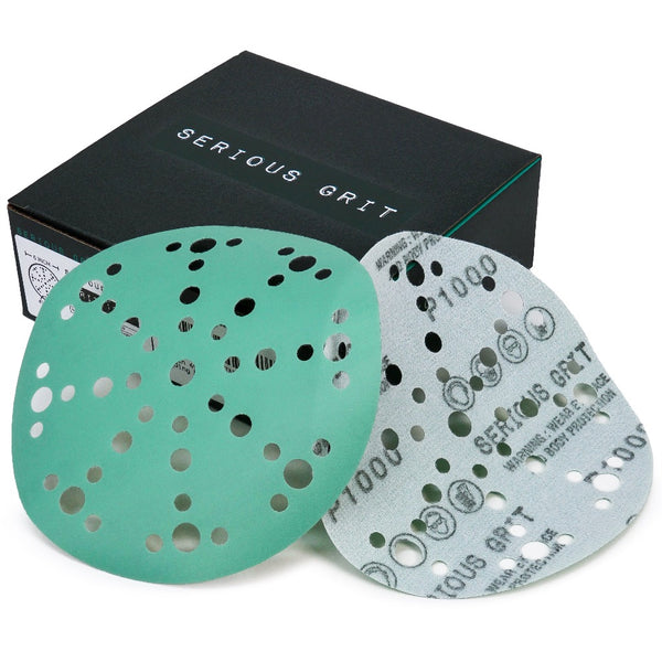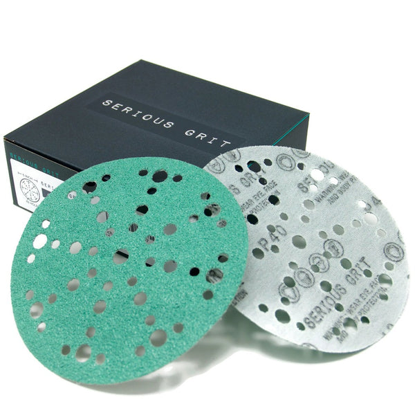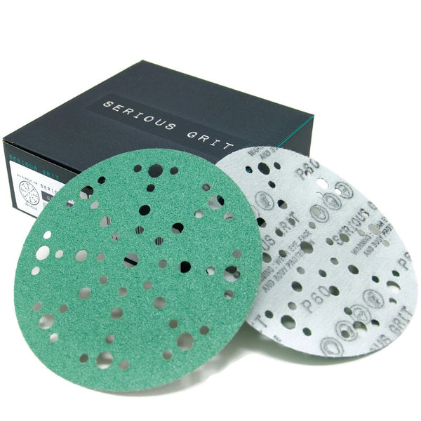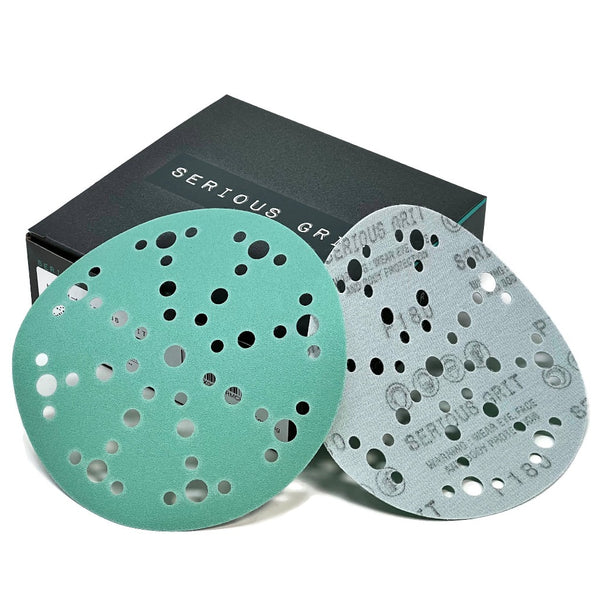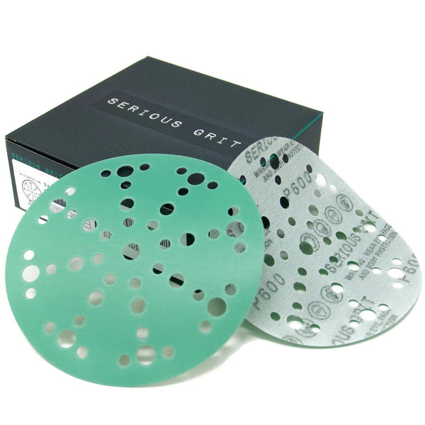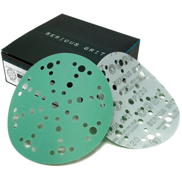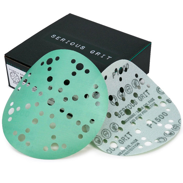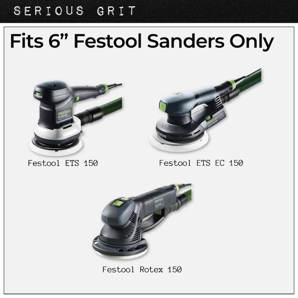 Serious Grit 6" 49 Hole sanding discs are premium film-backed discs designed to fit all Festool ETS and RO 150 series random orbital sanders with Multi-Jetstream 2 backing pads.