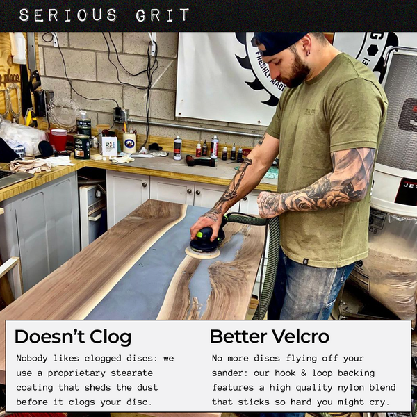 - Doesn't Clog - when your discs clog up with material, they lose their effectiveness quickly. Ours use a proprietary non-loading open coat zing stearate that sheds the dust before it has a chance to clog up.